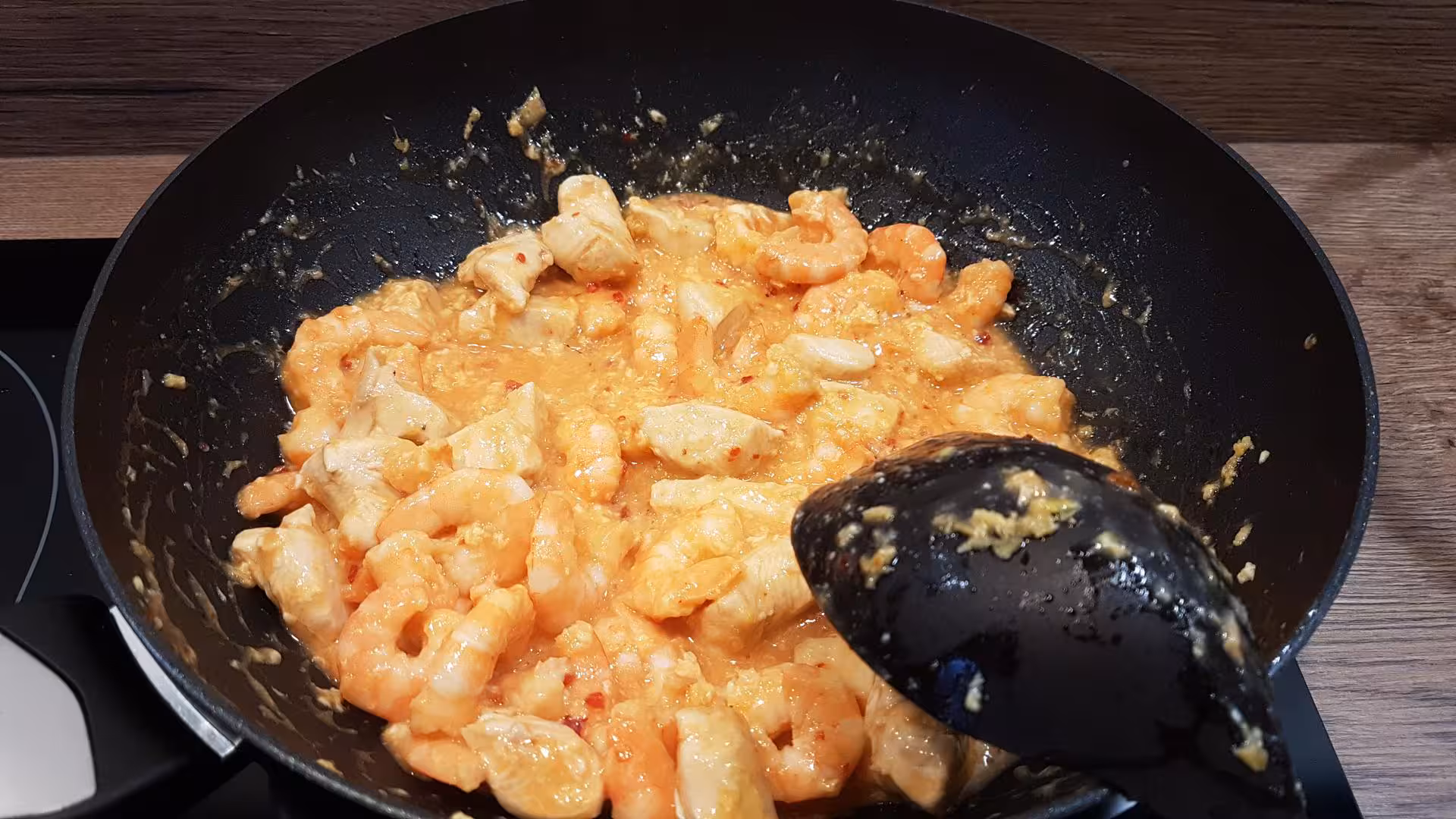 - Ajouter le poulet dans le wok jusqu’à ce qu’il soit cuit puis ajouter les crevettes.