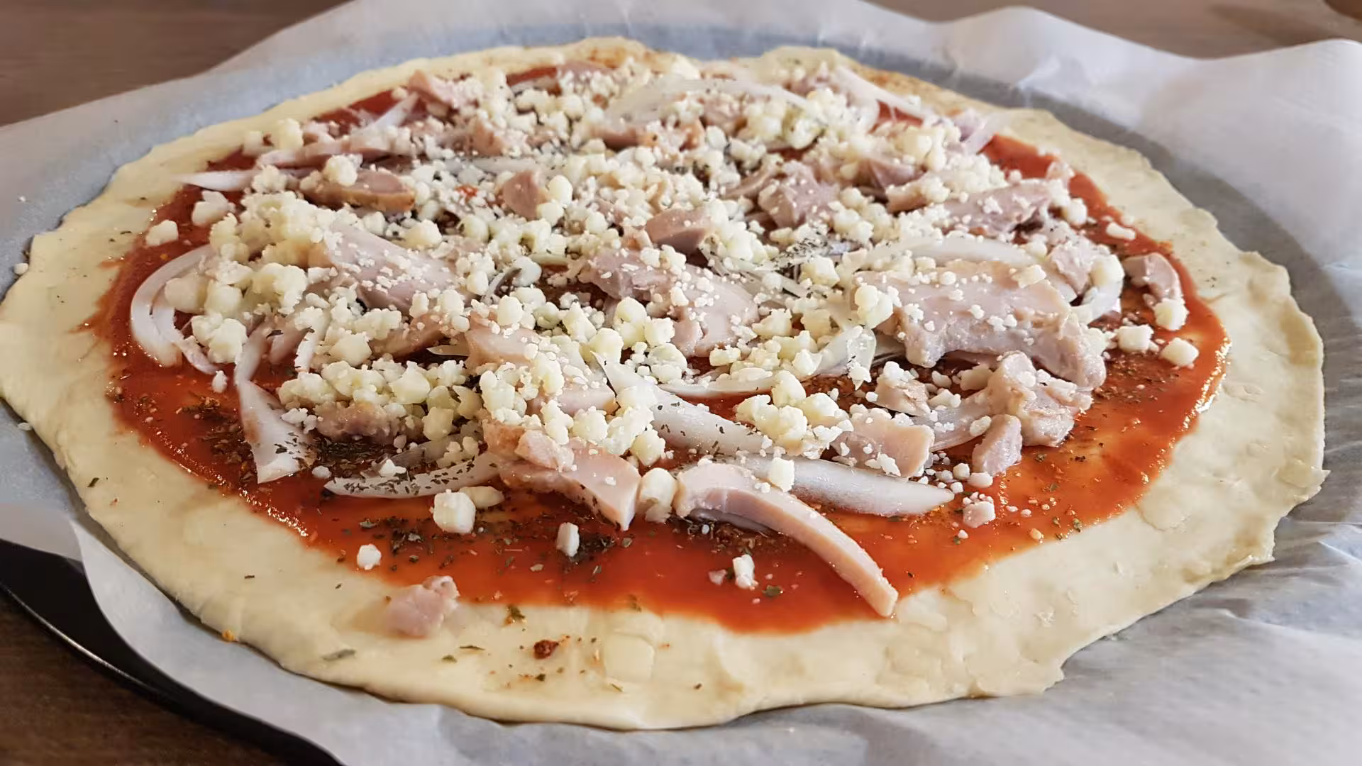 - Répartir les oignons, le poulet puis le fromage sur la pizza.