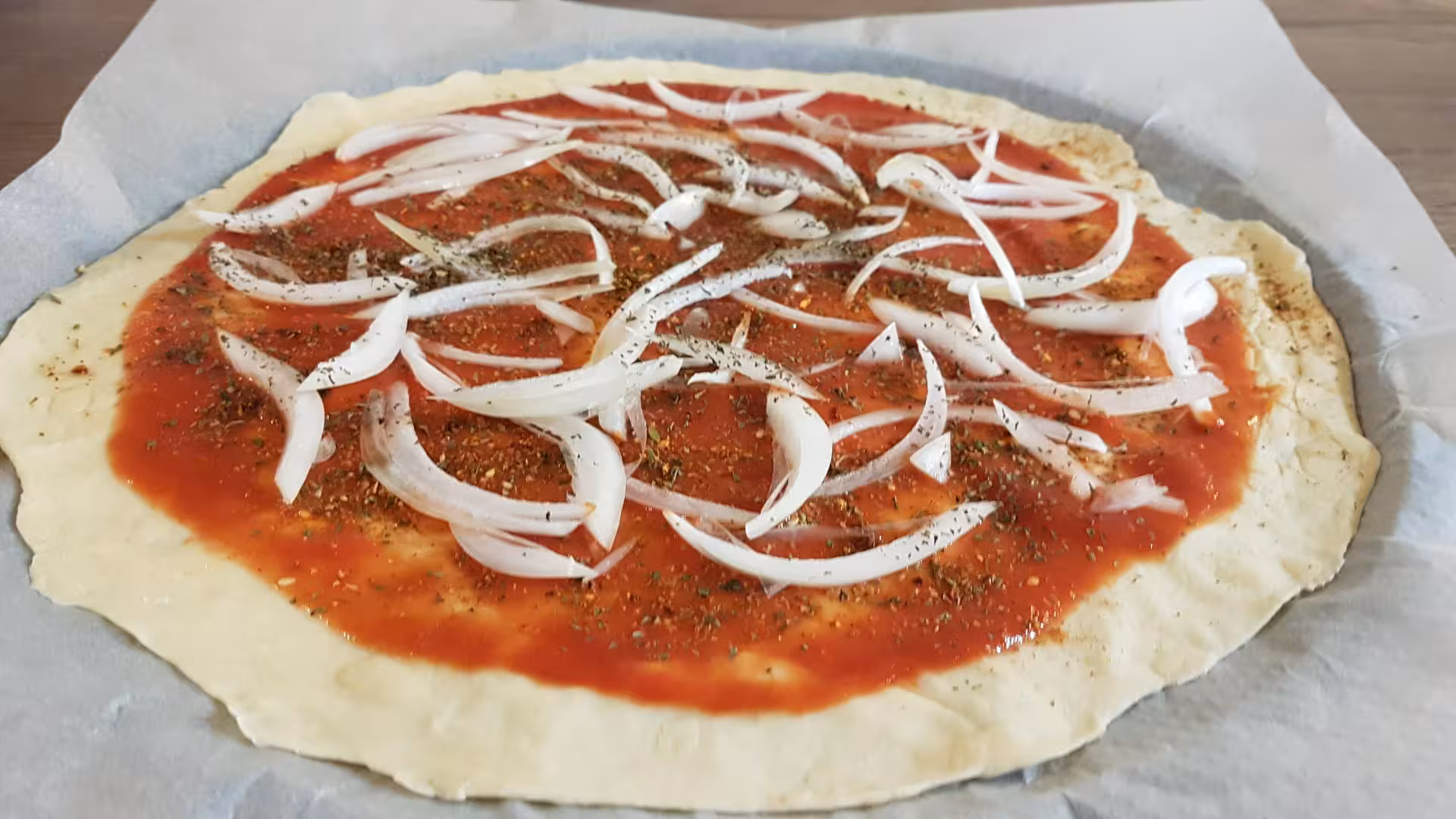 - Étaler la pâte à pizza et répartir la sauce tomate et ajouter les épices sélectionnées.