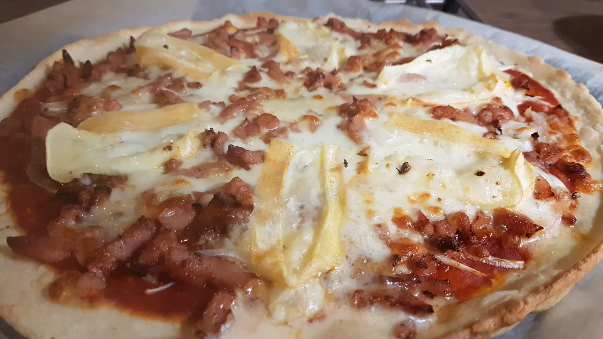 - Étaler la pâte à pizza et répartir la sauce tomate, les oignons puis les lardons.