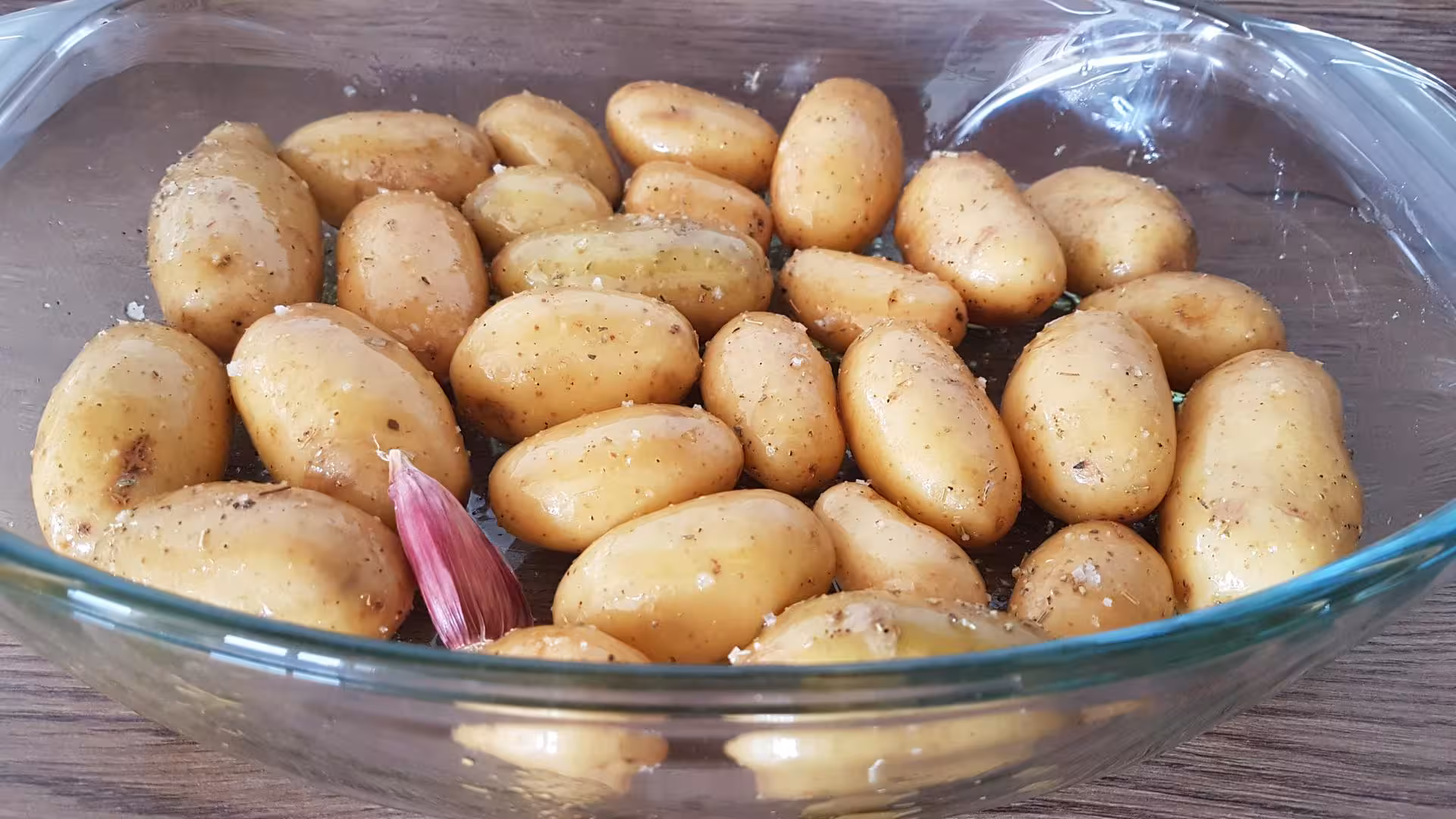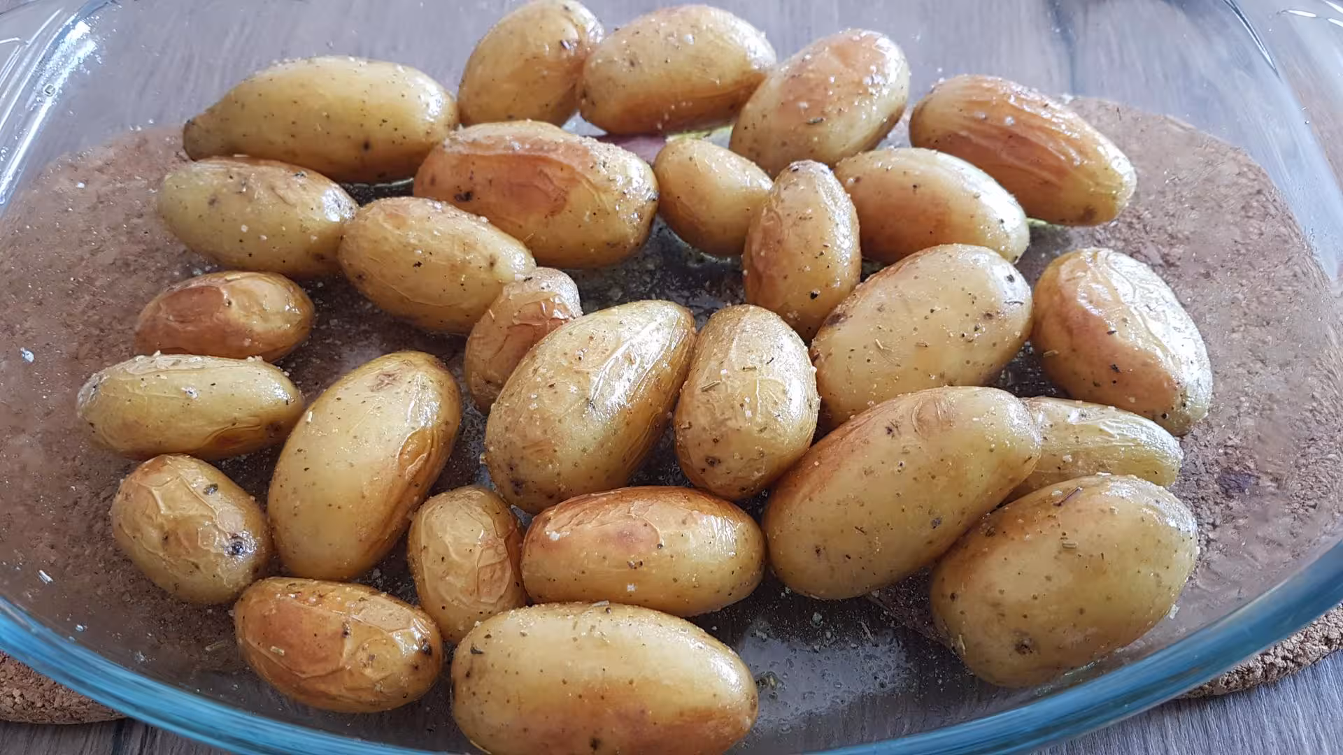- Bien laver les pommes de terre (la peau va être mangée) et les mettre dans un plat suffisamment grand pour qu’elles ne se recouvrent pas.