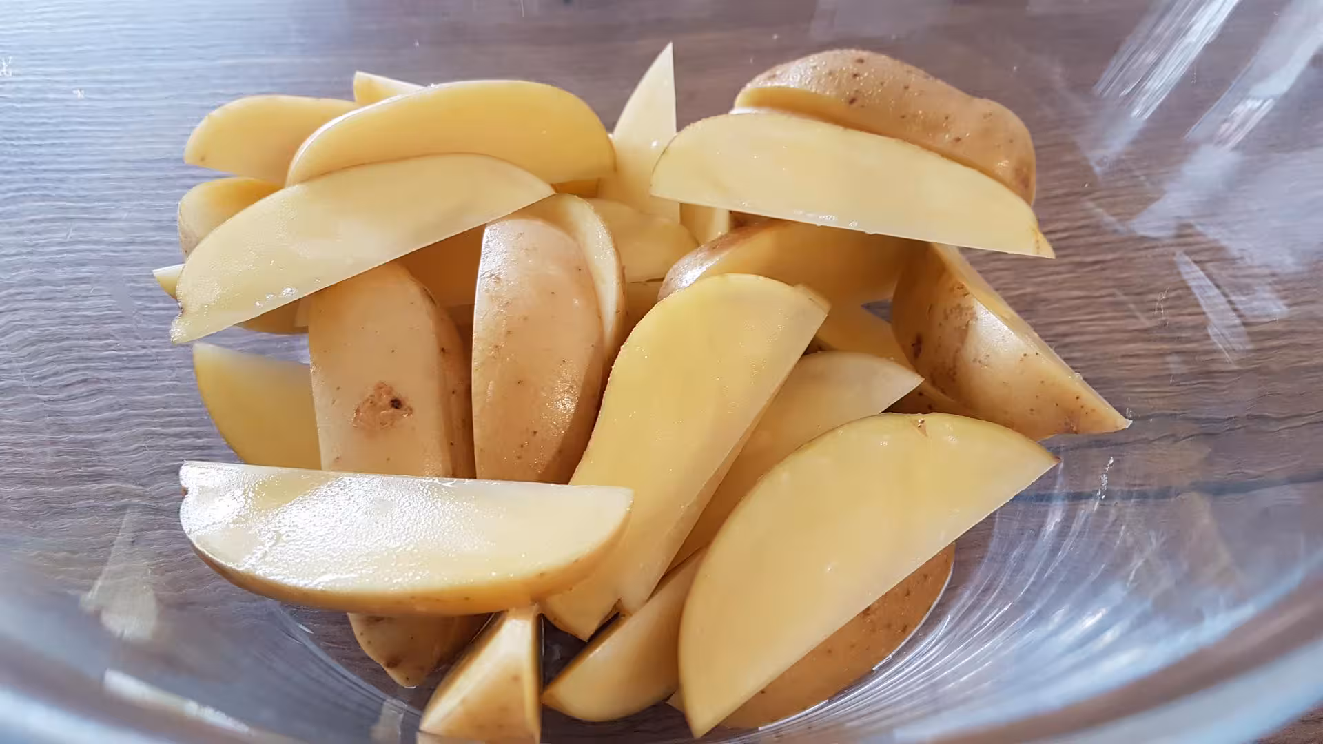 - Dans un saladier, mettre les pommes de terre coupées et le reste des ingrédients. Bien mélanger à la main pour que les pommes de terre soient toutes imprégnées de la marinade.