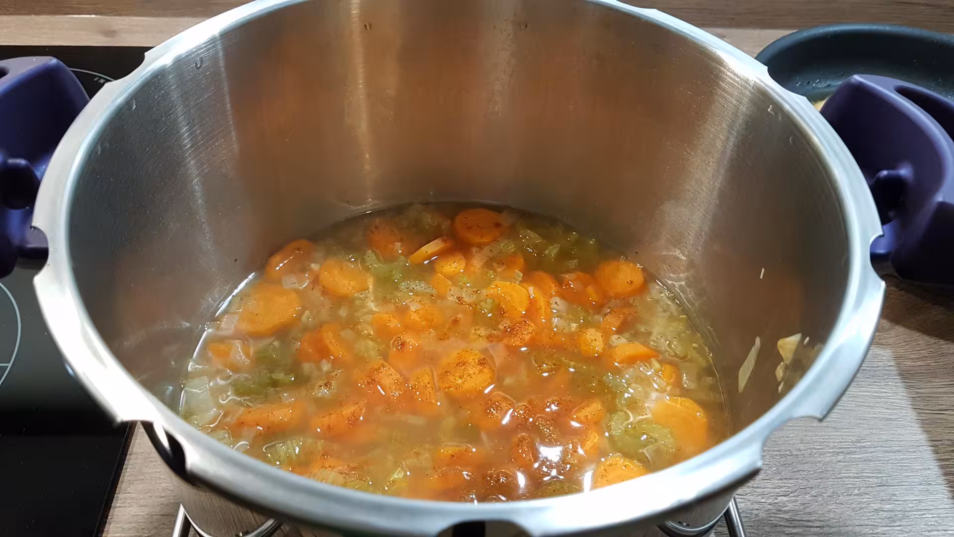 - Dans une cocotte minute, mettre l’eau, les légumes et le bouillon de volaille.