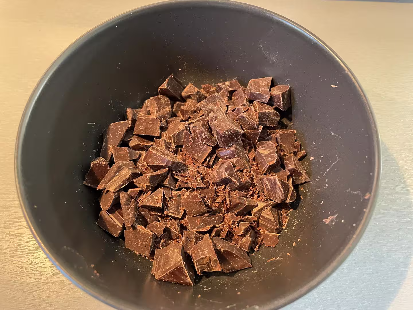 - Ajouter le chocolat en mélangeant jusqu’à ce qu’il fonde (remettre au micro-ondes si nécessaire).